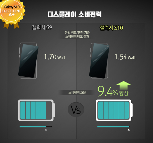 갤럭시S10에는 6.1인치에 해상도 3K QHD+(3040×1440)의 OLED가 탑재됐다. 최대 밝기는 갤럭시S9보다 6.9% 밝아졌고, 소비전력은 9.4% 절약됐으며, 색 정확도는 실제 색과 가깝게 좋아졌다. 눈에 피로를 주는 ‘블루라이트’ 비중을 갤럭시S9 대비 42% 낮춘 것도 최고등급 평가 요인으로 작용했다.