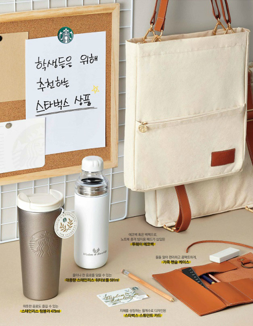 이들 상품 중 은빛의 ‘SS 밸류 스튜던트 텀블러'(473ml)와 대용량 사이즈 대비 가벼운 재질로 제작된 ‘SS 레나 스튜던트 워터보틀'(591ml)은 지혜를 상징하는 월계수를 그려 넣은 점이 특징이다. 이중벽 구조로 제작돼 보온·보냉효과가 우수하다는 게 스타벅스코리아 측 자랑이다..