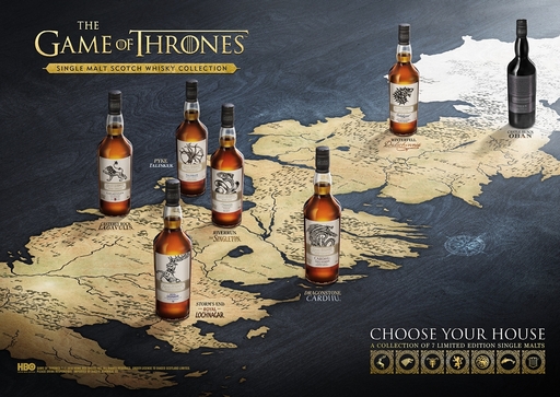 이번에 선보이는 왕좌의 게임® 싱글몰트 위스키 컬렉션은 디아지오의 몰트 브랜드인 싱글톤 글렌듈란, 탈리스커, 라가불린, 오반, 달위니 외에도 조니워커와 윈저의 브랜드 홈으로 널리 알려진 카듀, 로얄라크나가 증류소의 몰트 원액을 담은 7종으로 구성되어 있다.