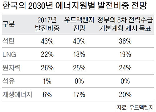 정부가 8차 전력수급기본계획에서 제시한 2030년 에너지원별 발전량 비중 목표는 석탄 36.1%, 액화천연가스(LNG) 18.8%, 원자력 23.9%, 석유 0.3%, 재생에너지 20.0% 등이다. 이에 반해 우드맥켄지는 2030년 에너지원별 발전량 전망치로 석탄 40%, LNG 18%, 원자력 25%, 석유 0%, 재생에너지 17%를 제시했다. 재생에너지가 정부 계획보다 3%포인트 낮고, 석탄과 원자력 발전 비중은 좀 더 높은 수치다.