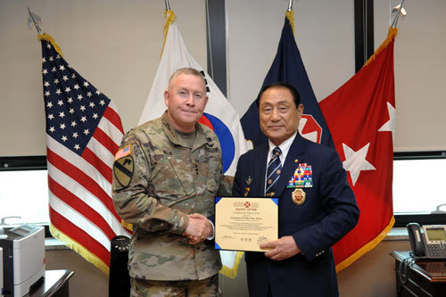 ‘추모의 벽’ 건립 모금 감사장 수여 입력 : 2019-03-28 03:00:00 수정 : 2019-03-27 21:24:56 구글 네이버 유튜브 김진호 대한민국재향군인회 회장이 27일 경기 평택시 소재 미 8군사령부에서 마이클 빌스 사령관으로부터 ‘추모의 벽’ 건립을 위한 독자적인 모금활동에 대한 감사장을 받고 있다. 대한민국재향군인회 제공 Copyright ⓒ 세계일보. 무단 전재 및 재배포 금지 세계일보 -