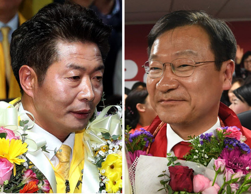 4.3 국회의원 보궐선거 창원·성산 선거구에서 당선된 정의당 여영국 당선인(왼쪽)과 통영·고성 선거구에서 당선된 자유한국당 정점식 당선인. 뉴시스