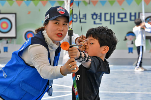 지난 5일 어린이날을 맞아 천안 종합운동장에서 열린 현대모비스 어린이 양궁교실에 참여한 아이가 전직 국가대표이자 올림픽 금메달리스트인 주현정 선수(왼쪽)로부터 양궁 기술을 배우고 있다. 여성 양궁 실업팀을 운영하고 있는 현대모비스는 양궁 인재 육성을 위해 2017년부터 전현직 양궁 선수들이 지도자로 참여하는 어린이 양궁교실을 개최하고 있다. 현대모비스는 이번 어린이날 행사를 시작으로 올해 말까지 국내외에서 18차례의 양궁교실을 운영할 예정이다.
