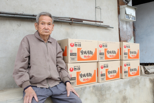 박병구 할아버지가 농심으로부터 기증받은 안성탕면 박스 앞에서 기념촬영을 하고 있다. 농심 제공.