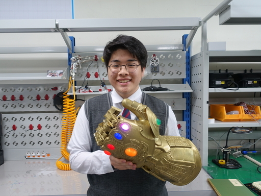 물어물어 ‘수도공고 타노스’를 만날 수 있었다. 3학년 5반 에너지전자제어과에 다니는 이창훈(사진)군. 그는 당초 원격으로 제어할 수 있는 건틀렛을 만들려 했지만 시간이 없었다며 아쉬워했다. 이군은 “타노스가 (건틀렛에 박힌) 특정 스톤을 사용할 때 그 스톤만 밝아지는 영화의 장면을 아두이노로 구현했다”며 “전자과의 특성을 살려서 발광다이오드(LED) 제어 기능을 건틀렛에 추가해봤다”고 말했다.