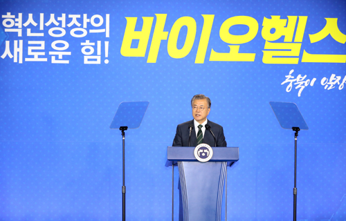 문 대통령은 이날 오전 충북 청주시 오송 CV센터에서 열린 ‘바이오헬스 산업 혁신전략 선포식’ 연설에서 “우리 정부는 바이오헬스 산업을 3대 신산업으로 선정했고, 벤처 창업과 투자가 최근 큰 폭으로 늘고 있다”며 “2030년까지 제약·의료기기 세계시장 점유율 6%, 500억불 수출, 5대 수출 주력산업으로 육성하고자 한다”고 말했다. 바이오헬스 산업의 전망에 대해서는 “전 세계적으로 평균수명이 길어지면서 우리의 관심은 ‘오래 사는 것’에서 ‘건강하게 오래 사는 것’으로 달라지고 있다”며 “바이오헬스 산업이 계속해서 성장·발전할 수밖에 없는 이유”라고 강조했다.