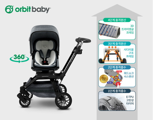 프리미엄 디럭스 유모차 오르빗G5는 충격흡수와 분산을 위한 4단계 안전시스템을 갖춘 제품이다. 4단계 안전시스템은 ▲’E-TPU 소재의 타이어’가 어떤 지형에서나 진동을 효과적으로 흡수하고, 세계특허 기술력인 ▲’더블 쿼드쇼크 서스펜션’이 충격을 두 번 흡수한다.