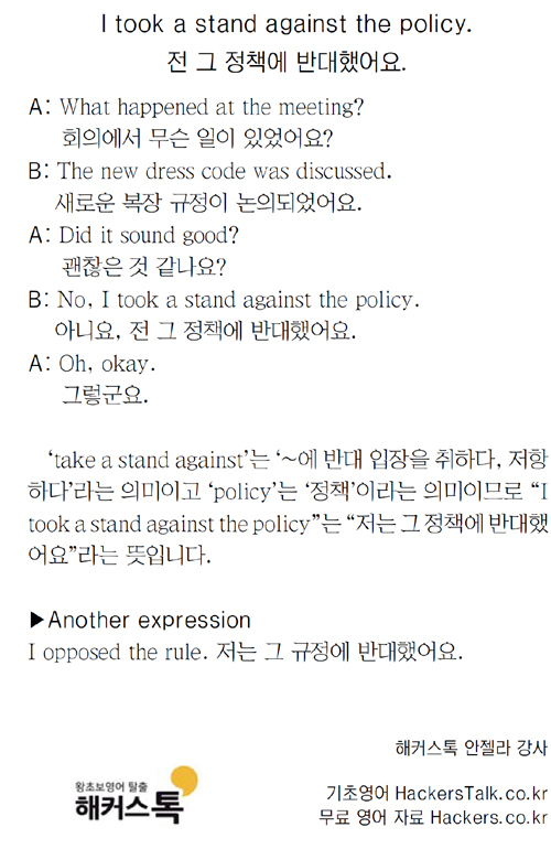 I took a stand against the policy. / 전 그 정책에 반대했어요.