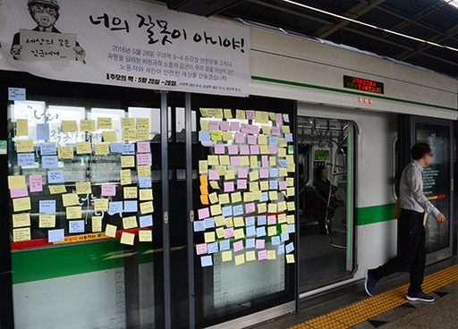 김군을 기억하기 위해 구의역에 마련된 ‘추모의 벽’ 스크린 도어에는 ‘너는 나다’, ‘모두가 안전한 세상이 왔으면 해요’, ‘구의역 김군을 잊지 않겠다’ 등 다양한 글귀가 적힌 포스트잇이 가득했다.