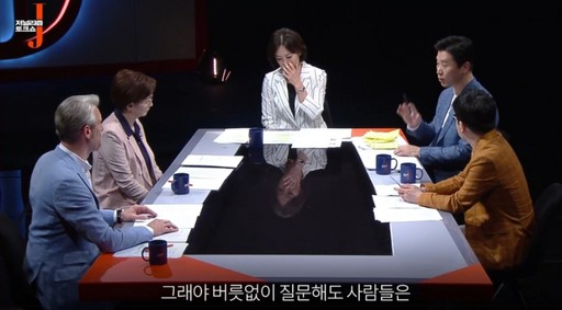 지난해 6월부터 KBS 1TV에서 일요일 오후 10시30분에 방송된 ‘저널리즘 토크쇼J’는 이유와 사건을 다루는 각종 일간지와 공중파, 종합편성 채널 등의 보도 행태를 비평하는 프로그램이다. MC 정세진 아나운서(사진 맨 오른쪽)와 더불어 정준희 중앙대 언론대학원 겸임 교수(〃 왼쪽에서 세번째), 팟캐스트 진행자 최욱(〃 맨 오른쪽), 김언경 민주언론시민연합 사무처장, 독일 기자인 안톤 슐츠(〃 왼쪽에서 두번째)가 고정 출연자로 활약 중이다.