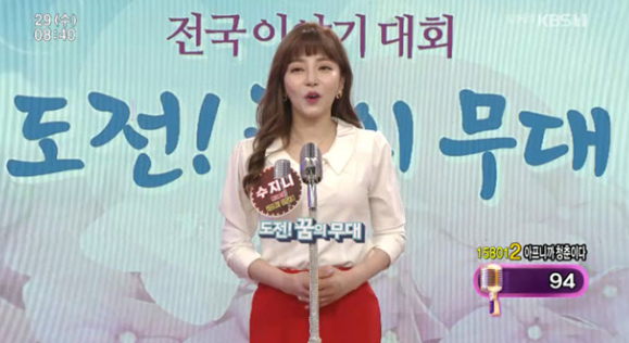 29일 오전 방송된 KBS 1TV ‘아침마당’의 ‘도전! 꿈의 무대’ 코너에 가수 수지니가 출연, 최진희의 ‘사랑의 미로’ 곡을 열창했다.