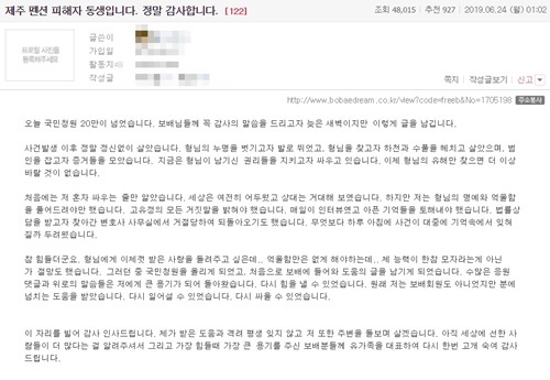 전처 고유정에 무참히 살해된 ‘제주 펜션 살인사건’ 피해자의 동생 강모씨가 자신이 올린 청와대 국민청원에 20만명이 동의한 데 대해 감사 인사를 전했다. 그는 “이제 형심의 유해만 찾는다면 더 바랄 게 없다”고 했다.