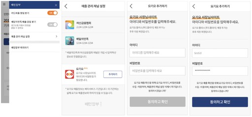 한 음식점의 업주가 배달의민족 외에 추가적으로 이용하고 있는 다른 배달앱의 매출까지 배민장부에서 한 번에 보기를 ‘선택’할 경우, 해당 배달앱의 업주 전용 사이트의 업주 아이디와 비밀번호를 배민장부 서비스 상에서 기입해 로그인하는 방식으로 간단히 연계만 하면 된다.