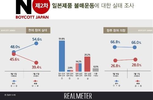 여론조사업체 리얼미터는 tbs ‘TV민생연구소’의 의뢰를 받아 전국 성인남녀 503명을 대상으로 일본 제품 불매운동 실태를 조사한 결과, ‘현재 참여하고 있다’는 응답이 지난주보다 6.6% 포인트 증가한 54.6%에 달했다고 18일 밝혔다.(신뢰수준 95% ·표본오차 ±4.4%p)