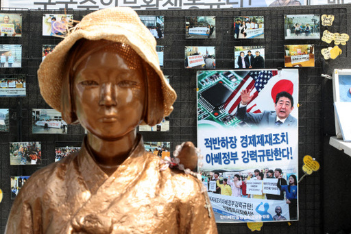 서울 종로구 옛 일본대사관 앞 소녀상 뒤로 일본의 경제제재 조치를 규탄하는 내용의 포스터가 붙어있다. 사진=연합뉴스