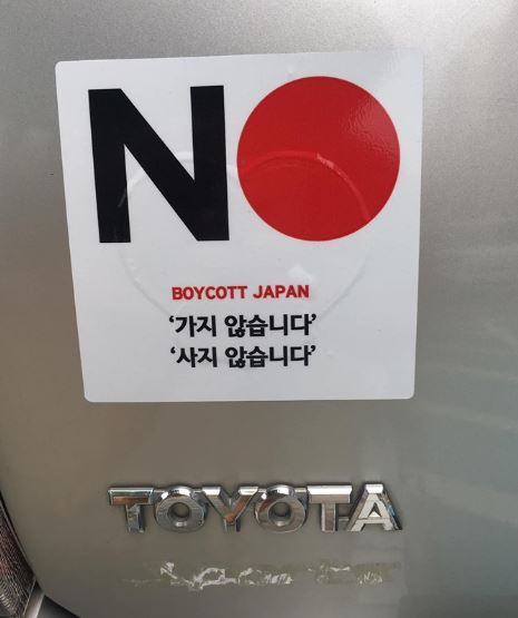 복수의 온라인 커뮤니티에는 '일본 불매 운동 참여'과 관련해 각종 사진이 올라오고 있다. 길거리에 '일본 자동차 타면 매국노로 간주한다'는 플랜 카드를 찍은 사진, 다수의 자동차 수리 센터에 걸린 '일본산 자동차 수리 불가'를 알리며 일본 자동차 수리를 거부하는 플랜카드, 주유소에는 '일본 제품 No, 일본차 주유 No'라며 일본차 주유를 거부하는 주유소도 등장했다.