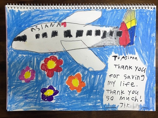 지난달 24일 서울 강서구 오쇠동 아시아나항공 본사로 이런 내용이 적힌 그림(사진)과 감사 편지 한 통이 도착했다. 그림과 편지는 미국에 살고 있는 최모(8)양과 그 아버지가 보낸 것이다.