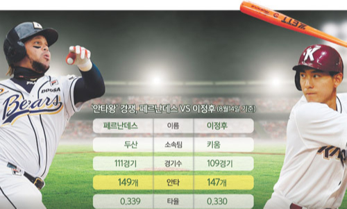 이런 가운데 뜨거움과 화려함으로 팬들을 유혹하는 단 하나의 카테고리가 바로 ‘최다안타왕’이다. 두산의 외국인타자 호세 페르난데스(31)와 키움의 이정후(21)가 한 치 앞을 모르는 선두경쟁을 펼치고 있는 데다가 두 선수가 만든 경쟁의 시너지로 역대 최다 안타 경신 가능성도 조금씩 생겨나고 있는 덕분이다.