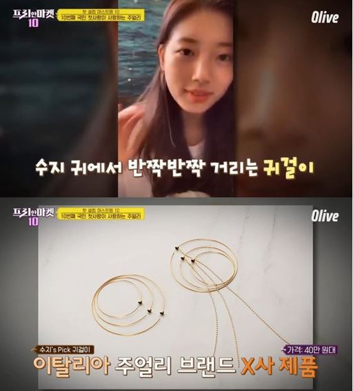 지난 21일 올리브 채널 ‘프리한마켓10’에는 배우 수지가 착용한 이탈리아 주얼리 브랜드 X사의 귀걸이가 소개됐다.