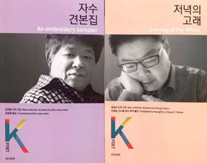 ‘K-포엣’ 시리즈는 아시아출판사에서 한글과 영어로 국내 시인들의 시를 동시에 게재하는 국내 유일 시집으로 ‘아마존’에서도 세계 독자들에게 판매한다. ‘K-픽션’에 이어 지난해 출범한 이 시리즈는 그동안 대표적인 한국 시인들의 시들 중에서 골라 실었지만, 이번에 출간한 두 권은 신작시를 청탁해 만들었다. 각각 7, 8번째 시리즈로 선보인 정일근의 ‘저녁의 고래’(Evening of the Whale·오른쪽)와 김정환의 ‘자수견본집’(An embroidery sampler·왼쪽)이 그것이다.