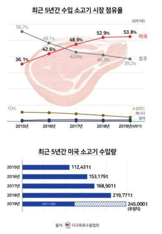 한국무역협회 자료에 따르면 2019년 상반기의 미국산 소고기 수입량은 2018년 동기 대비 10.4% 성장한 수치다. 점유율도 동기 대비 0.9%p 증가했다. 올해 상반기 호주산은 8만2213톤 수입되어 시장점유율 39.2%를 기록했다. 2017년 1, 2위가 바뀐 이래 미국산과 호주산의 격차는 올 상반기에만 3만톤 넘게 벌어졌다.