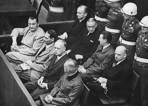 제2차 세계대전을 일으킨 나치 독일 전범들의 처단을 위해 열린 뉘른베르크 재판 모습. 앞줄 제일 왼쪽이 헤르만 괴링, 그 바로 옆이 루돌프 헤스. 미 국방부