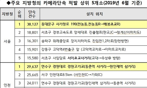 적발 건수 2만8916건의 경남 밀양시 상동면 금산리 상동초교 앞(청도→밀양, 시속 30㎞)과 2만5665건의 인천 서구 인천대로 서인천IC→가좌IC 8.5㎞ 구간도 ‘과속카메라 적발 전국 상위 5개소’에 포함됐다.