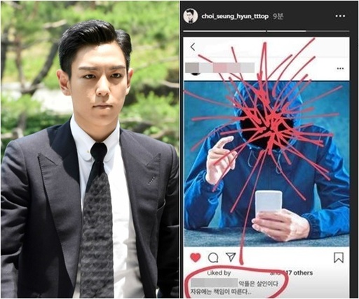 탑은 16일 자신의 인스타그램에 “악플은 살인이다. 자유에는 책임이 따른다”라고 쓰인 다른 SNS 계정 화면을 갈무리해 올렸다.