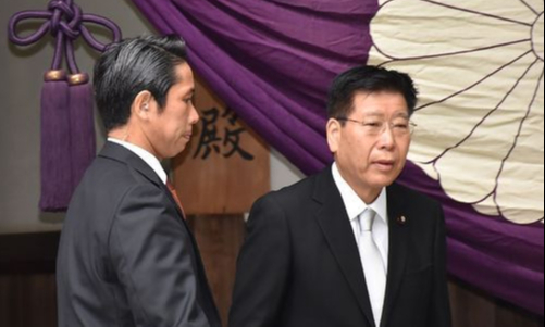 일본 각료의 야스쿠니신사 참배는 2017년 4월 춘계 예대제(봄 제사) 당시 다카이치 사나에(高市早苗) 총무상 이래 처음이다. 신사는 종교시설이어서 각료의 공식 참배에 대해 일본 내에서도 논란이 있다.