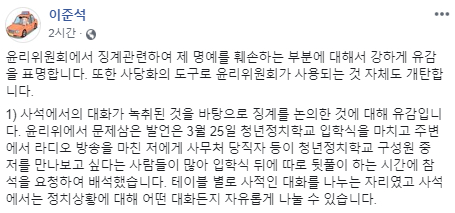 ◆이준석 “사석 대화 바탕으로 징계...유감·개탄”