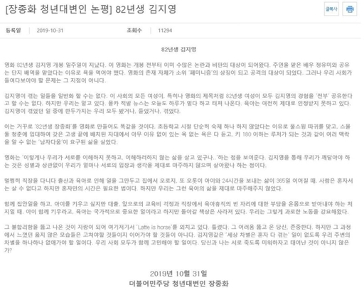 앞서 장종화 민주당 청년대변인은 지난달 31일 논평을 내고 영화 ‘82년생 김지영’에 대해 “영화는 개봉 전부터 이미 수많은 논란과 비판의 대상이 됐다”며 “우리 사회가 들여다보아야 할 문제는 그 지점이 아니다”라고 했다.