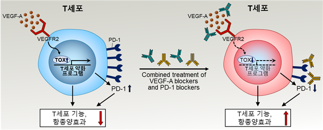 연구팀에 따르면 암세포에서 생성된 혈관내피성장인자는 암세포에 대항하는 T세포 표면에 발현하는 수용체에 결합해 톡스(TOX)라 불리는 단백질의 발현을 유도하고, 톡스는 T세포의 기능을 억제하고 약화하는 유전자 발현 프로그램을 작동시키는 것으로 밝혀졌다.