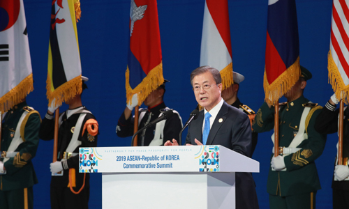 문재인 대통령은 이날 부산 힐튼호텔에서 주재한 한·아세안 특별정상회의 환영 만찬에서 “아세안의 꿈이 한국의 꿈”이라며 "한·아세안 특별정상회의는 ‘하나의 공동체’를 향해 우리가 같은 꿈을 꾸고 있다는 것을 보여줄 것”이라고 말했다.