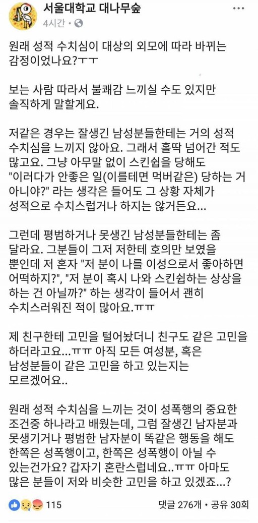 여성으로 보이는 글쓴이는 재학생만 작성할 수 있는 페이스북 페이지 ‘서울대 대나무숲’에 ‘잘생긴 남성에겐 성적인 수치심을 안 느끼지만 상대적으로 외모가 못하면 호의만 보였을 뿐인데도 든다‘는 취지의 글을 게재했다.