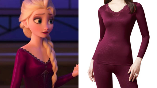 '겨울왕국2' 영화 속 한 장면에서 엘사는 V넥에 레이스 장식이 있는 보라색 드레스를 입고 등장한다. 이에 대해 누리꾼들은 "엘사 드레스 빨간 내복 같았다" "엘사가 추위에 강한 이유다" 라는 반응을 보이면서 화제가 됐다.