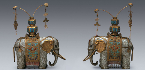 ‘겹사법랑 코끼리 받침 보병’은 건륭 연간에 제작되어 황제의 집무 공간인 대전을 장식했던 것이다. 코끼리 몸체는 가는 얼룩 문양을 새겼고 귀와 상아, 꼬리는 도금해 화려함을 더했다. 대전의 계단에 배치했던 학 모양의 촛대 한 쌍 역시 법랑기법으로 제작된 것이다. 풀과 붉은색 꽃이 피어있는 특이한 모양의 돌 위에 올라선 학이 연잎 모양의 촛대를 물고 있는 형태다. 침이나 가래를 뱉는 그릇조차도 법랑기를 사용했다. ‘화법랑 꽃문양 타호’는 노란색 바탕에 다양한 꽃, 과일, 나비 등을 그리고 공간에 갈색 반점을 세밀하게 찍어 명암과 질감을 섬세하게 표현했다.
