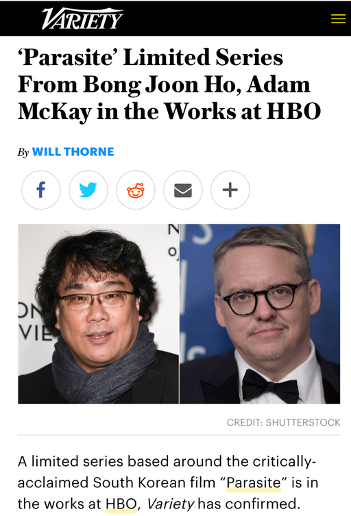 ‘기생충’을 투자 배급한 CJ ENM은 10일 “아직 최종 사인은 하지 않았지만 ‘기생충’을 HBO 드라마로 만들기로 사실상 합의했다”고 밝혔다. 제작에는 영화 ‘빅쇼트’ ‘바이스’로 독특한 작품세계를 구축한 애덤 매케이 감독과 봉준호 감독, CJ ENM이 책임 프로듀서로 참여한다.