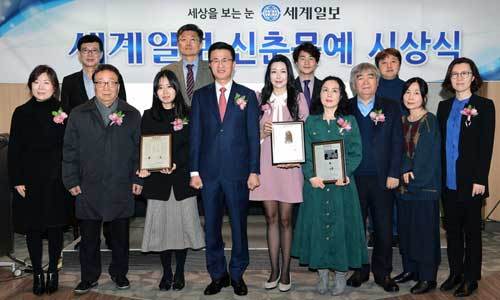 13일 서울 종로구 세계일보 유니홀에서 열린 ‘2020 세계일보 신춘문예’ 시상식에서 정무늬(본명 정연실·38·소설), 김지오(본명 김임선·58·시), 김정빈(22·문학평론)씨는 정희택 세계일보 사장과 심사위원들의 격려를 받으면서 당선의 영예를 안았다.