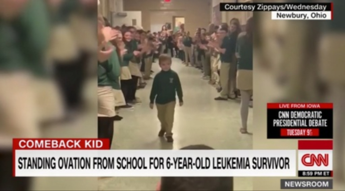 급성 림프구성 백혈병(acute lymphoblastic leukemia)으로 3년간 학교를 떠나야 했던 미국의 6살 소년이 마지막 항암치료와 함께 병마를 떨치고 돌아온 날, 그를 기다리던 수많은 학생들의 박수가 쏟아져 훈훈한 감동을 선사했다.