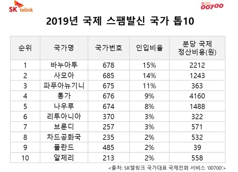 SK텔링크의 국제전화 서비스 ‘00700’은 지난 한 해 동안 차단한 국제 스팸전화 분석 결과를 토대로 ‘스팸 발신이 가장 많은 국가 톱(Top)10’을 16일 공개했다.