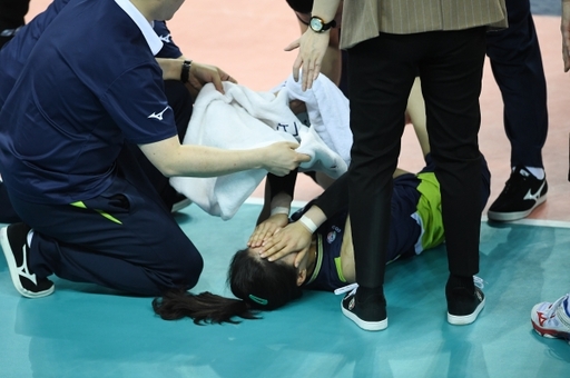 현대건설 김연견이 4일 인천 계양체육관에서 열린 도드람 V리그 여자프로배구 경기에서 왼쪽 발목에 부상을 당한 후 쓰러져 있다. KOVO 제공