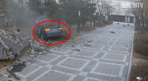 급가속한 차량은 우선 아파트 차단기를 들이받고 단지내 볼라드와 정자를 날으듯이 들이받고서야 멈춰선다. 멈춰선 차량은 브레이크 등이 점등되며 영상은 종료된다.