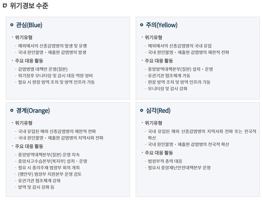 질병관리본부에 따르면 감염병 위기 대응체계 중 위기 경보 수준은 ‘관심(Blue)’, ‘주의(Yellow)’, ‘경계(Orange)’, ‘심각(Red)’ 등 총 4단계다.