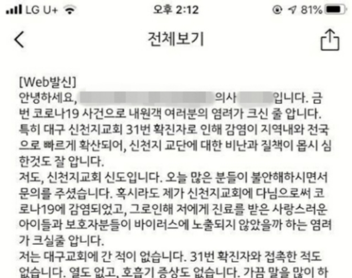 26일 경북 지역 커뮤니티 등에 따르면 자신을 칠곡의 한 소아청소년과 의사라고 밝힌 A씨는 최근 내원객에게 보낸 단체 문자메시지에서 “금번 코로나19 사태로 여러분의 염려가 크신 줄 안다”며 “특히 대구 신천지교회 31번 확진자로 인해 감염이 지역 내와 전국으로 빠르게 확산해, 신천지 교단에 대한 비난과 질책이 몹시 심한 것도 잘 안다”고 말했다.
