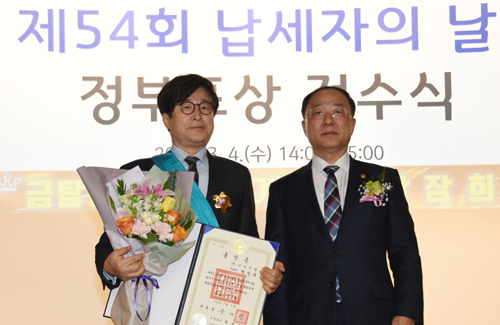박장희 기도산업 대표(왼쪽)가 4일 열린 ‘제54회 납세자의 날’ 기념 훈·포장 전수식에서 홍남기 경제부총리 겸 기획재정부 장관으로부터 금탑산업훈장을 전달받은 뒤 기념촬영을 하고 있다. 기획재정부 제공