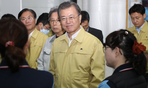 문재인 대통령이 6일 오후 마스크 생산업체인 경기도 평택시 ㈜우일씨앤텍을 방문, 업체 관계자로부터 건의사항을 듣고 있다. 연합뉴스