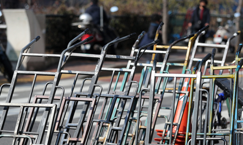 18일 서울 동대문시장에서 근거리 배송에 사용되는 손수레와 등지게가 배송물량이 없어 길가에 놓여 있다. 연합뉴스