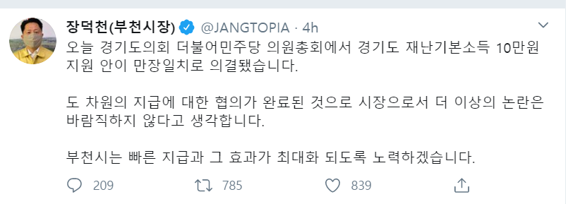 25일 오후 장덕천 부천시장은 트위터에 “오늘 경기도의회 더불어민주당 의원총회에서 경기도 재난기본소득 10만원 지원안이 만장일치로 의결됐다”며 “도 차원의 지급에 대한 협의가 완료된 것으로 시장으로서 더 이상의 논란은 바람직하지 않다고 생각한다”고 일축했다.