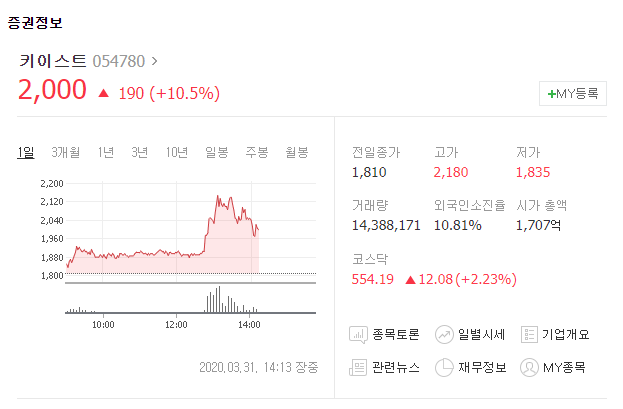 키이스트는 31일 오후 2시13분 기준 전일대비 10.5%(190원) 상승한 2000원에 거래되고 있다. 이는 방탄소년단의 소속사인 빅히트 엔터테인먼트의 실적 상승 영향이 큰 것으로 보인다.