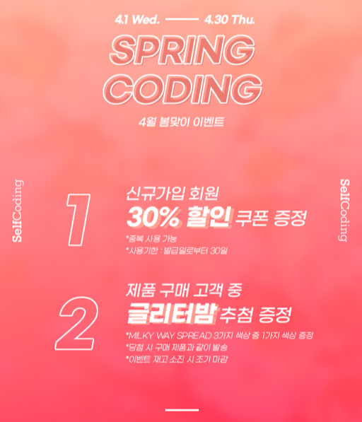 한편, 셀프코딩(SelfCoding)의 4월 'Spring Coding! 30% 할인 & 선물 증정 이벤트'에 대한 자세한 내용은 셀프코딩 공식 홈페이지를 통해 확인할 수 있다.